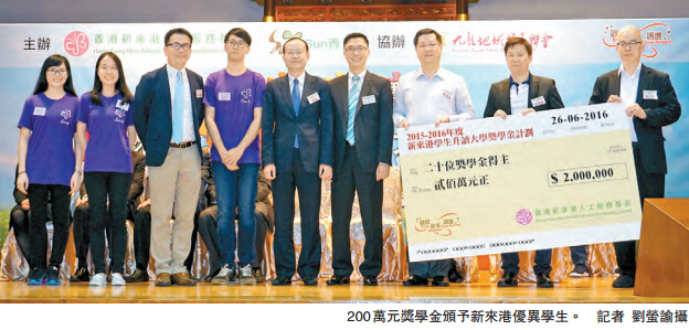 【香港商报网讯】记者刘萤谕报道:香港新来港人士服务基金昨日举办第4届「新来港学生升读大学奖学金颁奖典礼」,本年度共资助20名新来港优异学生共200万元,每人可获10万元以缴付大学大部分学费。基金会长邓清河、教育局副局长杨润雄及中联办九龙工作部部长何靖等均到场为典礼致辞。