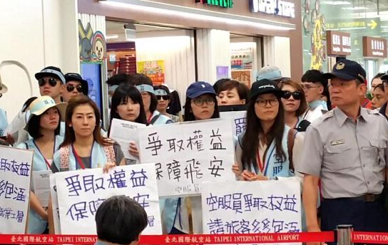6月24日,以臺灣中華航空公司空服員為主的桃園市空服員職業工會于凌晨起罷工。當日上午6時到晚上10時,桃園機場及松山機場出發共67班航班全部取消,受影響旅客約2萬多人。圖為罷工代表在松山機場打出“空服員爭取權益,請旅客多多包涵”等標語,向乘客解釋情況,請大眾理解并支持罷工。 中新社記者 邢利宇 攝
