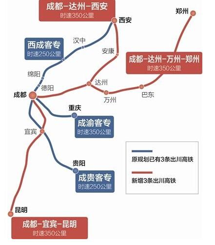 蓉京高鐵、蓉昆高鐵都是全程350公里時速的高鐵鐵路。蓉京高鐵從成都引出,經南充、達州進入重慶境內,在萬州與在建的渝萬客專及規劃建設的鄭萬客專相接,直達京津冀經濟區,形成成都連接長江經濟帶沿線的快速客運通道;蓉昆高鐵從成都引出,經天府國際機場至自貢與川南城際鐵路相連,在宜賓接入渝昆高鐵,形成成都直達昆明的快速客運通道。兩條新的出川大通道,將解決四川向東、向北、向南的高鐵鐵路出川瓶頸,更好地融入全國高鐵網。