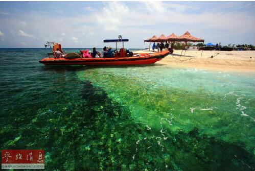 一艘小船停靠在中國南海西沙群島水域。新華社發