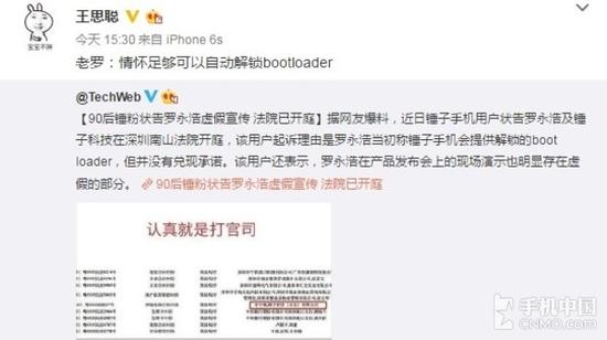 其實,相比於老羅和這名錘粉約戰視頻網站,個人倒是對老羅約戰王思聰挺感興趣的。在這場大戰中,國民老公王思聰也在一旁煽風點火,假借老羅之口稱,情懷足夠可以自動解鎖bootloader。真是看熱鬧不嫌事兒大,坐等老羅跟王思聰優酷見!