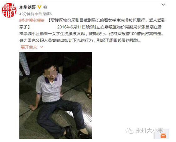 新浪微博网友@永州铁哥发帖称,这是张某第二次偷看这名未成年女孩洗澡,身为国家公职人员竟做出如此下流行为,脸都丢大了。