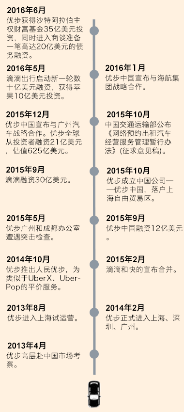 2014年2月,優步正式進入中國,在上海、廣州、深圳三個城市推出豪華車服務。阻礙優步的有許多道“減速帶”,包括谷歌地圖(Google Maps)在中國被屏蔽,而優步要靠它來定位司機和乘客,于是優步只得重新設計軟件。那年秋天,優步擴大了業務范圍,推出了平價服務“人民優步”(People’s Uber),任何人只要能通過背景審核,都可以用自己的私家車提供打車服務。2014年底時,優步在中國專車市場已獲得了約1%的市場份額。