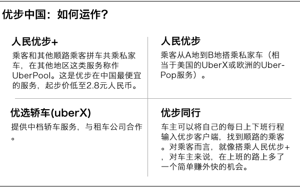 許多優步司機表示如果沒有獎勵他們不會拉活兒,而乘客也表示如果叫車變貴了他們會減少使用。32歲的北京居民徐德勝(音)表示:“我過去基本用滴滴,不過現在換成了優步,因為它更便宜。”他表示由于價格便宜,自己現在每天都用優步叫車。雖然優步的服務也包括豪華車,但便宜的叫車服務才是優步在中國的業務堡壘。優步的拼車服務以低至2元人民幣(合21便士)的車費,在幾個重點城市占叫車量的逾一半。