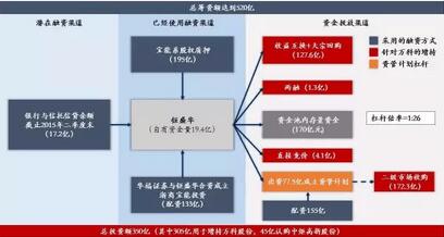 據地產財富會爆料,其拿到一份專業機構的調研報告顯示,鉅盛華以19億自有資金操作了高達520億元的資金量,綜合杠桿率高達26倍。該報告指出:鉅盛華的自有資金包括截止2014年12月31日的賬上現金3.2億元,以及2015年1月至10月的經營現金流凈額16.2億元。根據細致的現金流測算,鉅盛華利用銀行信貸、股權質押、華福證券“假股真債”、資管配資四重杠桿,操作著高達520億元的資金量。其中:305億元用于購買萬科股票,仍有170億元存量資金。