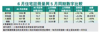 香港置業資料研究部指出,新界區是受惠於一手急升帶動,由5月同期的460宗急升約70%至6月至今的約791宗,帶動新界區整體住宅註冊量錄逆市上升。