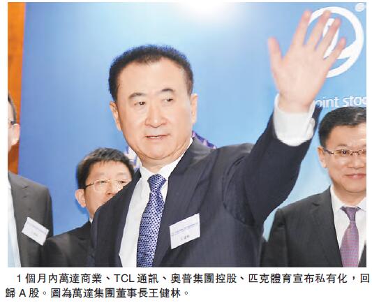 近日港股遭冷遇,1个月内就有万达商业(3699)、TCL通讯(2618)、奥普集团控股(477)、匹克体育(1968),4家企业均宣布私有化,回归A股。