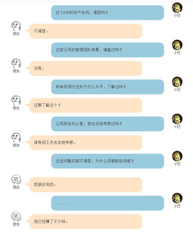 这个P2P的资产去向,清楚吗?小巴朋友不清楚。这家公司的管理团队背景,调查过吗?小巴朋友没有。利率在同行业处于什么水平,了解过吗?小巴朋友还要了解这个?公司所在办公室,有去实地考察过吗?小巴朋友谁有闲工夫去实地考察。这些问题你都不清楚,为什么你都敢投资呢?小巴朋友我朋友说的。…………小巴朋友他已经赚了不少钱。
