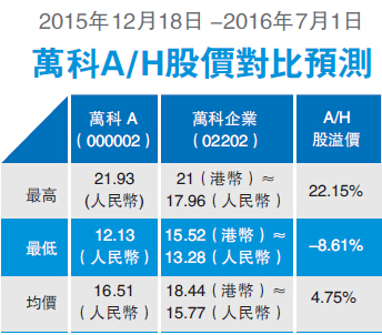 業內人士梳理了幾種不同的測算情況,分別按歷史A/H股溢價、大盤和行業走勢、市盈率來測算,萬科A股價在復牌后可能處在一個什麼「段位」上,股民就算是被「割韭菜」,也能知道被割多少。分析人士按照A/H均價溢價比的換算,萬科A復牌應該為16.51元/股,較停牌前24.43元/股,低32%,也就是說復牌后至少有3個跌停板。