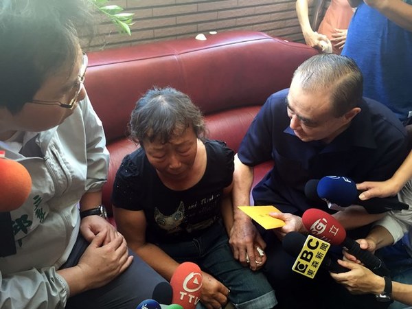 台防務部門負責人馮世寬(右)2日上午前往遭雄三飛彈誤射身亡的黃姓船長家道歉致意