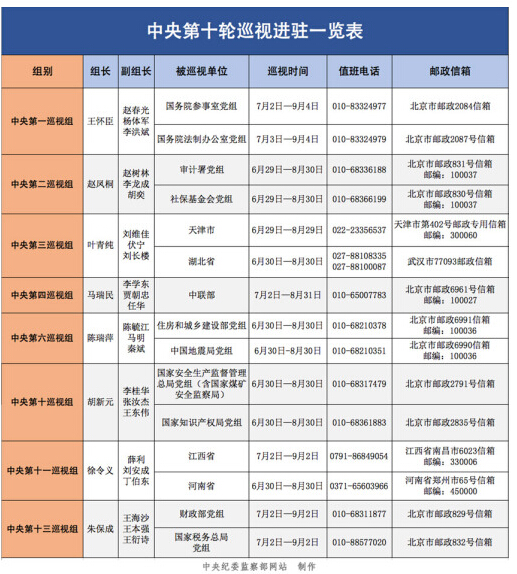 京華時報訊(記者沙雪良)6月29日至7月3日,中央第十輪巡視第一、二、三、四、六、十、十一、十三等8個巡視組,已陸續入駐國務院參事、國務院法制辦、審計署、社保基金會等12家中央單位及湖北、天津、江西、河南等第二批“回頭看”的4個省份。在4省份動員會上,巡視組組長葉青純、徐令義均表示,巡視組將按照政治巡視要求,重點監督檢查黨的領導核心作用發揮情況、黨的建設情況、全面從嚴治黨主體責任和監督責任落實情況、黨風廉政建設和反腐敗工作情況、執行換屆紀律和選人用人情況、中央八項規定精神落實情況和巡視反饋意見整改落實情況等,對沒見底的問題“再了解”,對沒發現的問題“再發現”,形成有力“再震懾”。