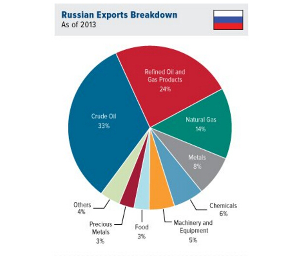 下圖為2013年俄羅斯出口商品分解圖。從圖中不難看出,原油出口額占了俄羅斯總出口額的33%,精煉油和石油產品占了24%,而天然氣則占了14%,這三項的總占比為71%。
