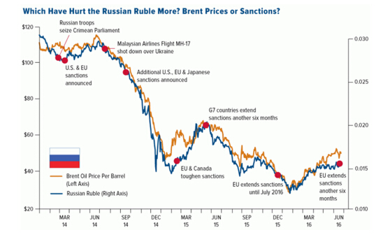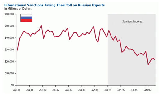 但是制裁措施也造成了非常顯著的影響。根據國際貨幣基金組織的數據,貿易限制措施是俄羅斯2015年國內生產總值減少1.5%的原因,制裁措施持續時間越長,其影響將越大。