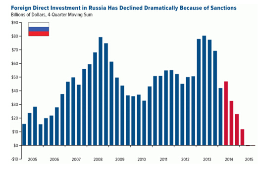 下圖表明由于制裁措施俄羅斯獲得的外國直接投資已經大幅減少。