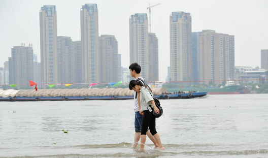 6月30日,武漢漢口江灘江水漫上親水平臺。不少市民挽起褲腳在水中漫步休閑。近日,長江武漢段水位呈快速上漲趨勢。