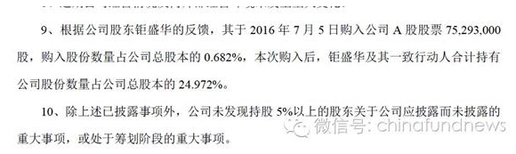 看萬科昨晚公告:“根據公司股東鉅盛華的反饋,其于2016 年7 月5 日購入公司A 股股票75,293,000股,購入股份數量占公司總股本的0.682%,本次購入后,鉅盛華及其一致行動人合計持有公司股份數量占公司總股本的24.972%。”