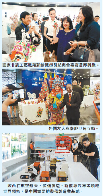 除現場推介環節外,會場外還設置了陝西主題圖片展,采用燈箱、多媒體、沙盤模型、實物展覽等多種手段,全面展示陝西「一帶一路」建設的成就和願景、元首家鄉外交成果與國際交流成果。在互動環節,安排了寶雞馬勺臉譜上色、拓片拓印體驗、鳳翔彩繪泥塑繪制、陝西剪紙表演等,引起與會嘉賓的極大興趣。最吸睛的是,展區運20大型運輸機、新舟60支線客機、航天運載火箭、陝汽重卡、比亞迪新能源汽車等模型琳瑯滿目,機器人表演惟妙惟肖,新材料產品、3D打印等,讓與會嘉賓領略了陝西制造、陝西科技、陝西文化的巨大優勢,同時看到了與陝西攜手合作的美好前景。