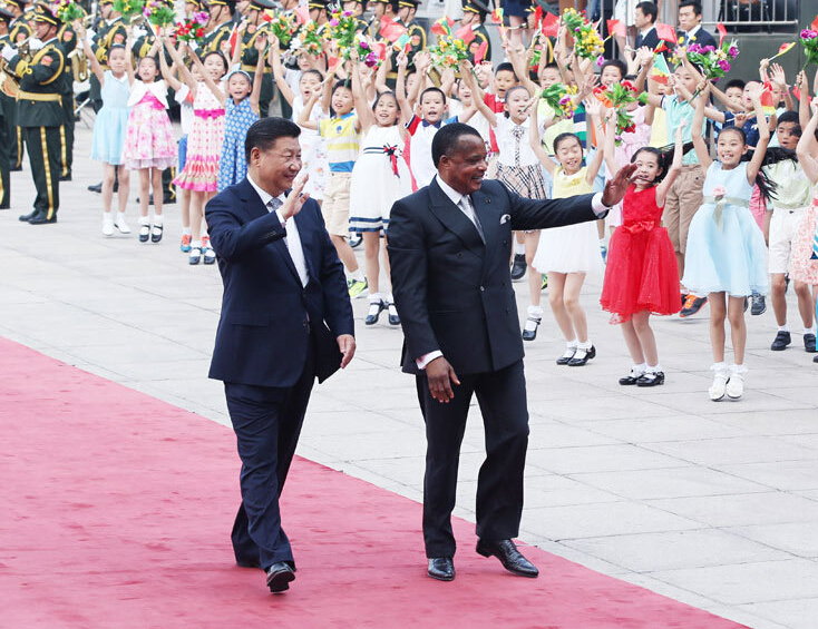 7月5日,國家主席習近平在北京人民大會堂同剛果共和國總統薩蘇舉行會談。會談前,習近平在人民大會堂東門外廣場為薩蘇舉行歡迎儀式。新華社記者姚大偉攝
