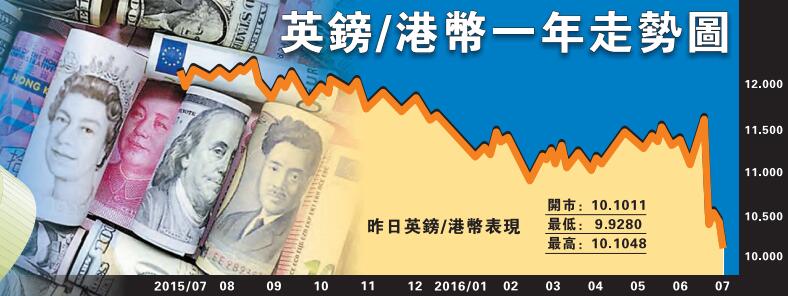 由於市場避險情緒再度升溫,英鎊匯價跌勢加劇。昨日,英鎊兌美元一度迫近1.28,低見1.2801,跌幅深達1.68%。至昨晚8點半,英鎊兌港元亦跌至「10算」左右水平。