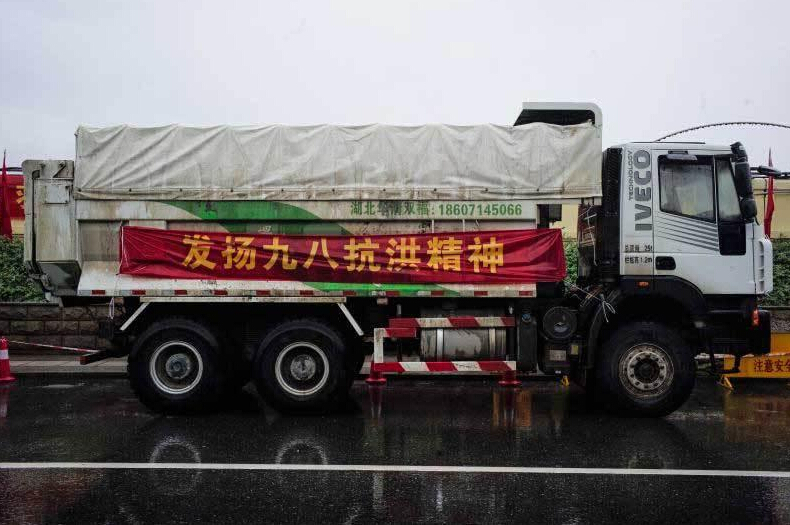 車身上掛著橫幅“發揚九八抗洪精神”。