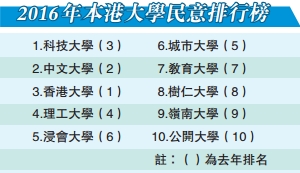 專業教育網昨日公布了2016年第18屆香港最佳大學排名榜調查結果,調查以真人電話方式訪問了1222人,於今年5月12至27日期間進行。調查有4個排名,包括教育網排名榜、綜合排名榜、民意排名榜及學界排名榜。其中長居民意排名榜首位的香港大學,今年首次跌落第3位。時美真坦言,多年來編寫報告,第一次看到港大不是第1名,感到很驚訝。她說,結果很容易令人將港大近年發生的一連串風波聯想起來,引來港大要為學生行動付上名氣代價的感覺,令市民心目中的排名有所改變。