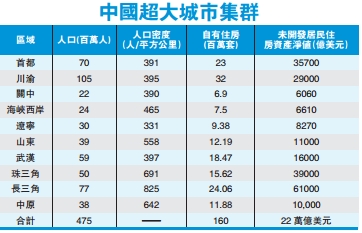 2010年聯合國人居報告中提到了世界範圍內「超大城市集群」(mega-regions)的增長趨勢:「已經很大的城市不斷擴張并與其他鄰近城市接壤,從而形成新的更巨大的經濟緊密聯繫的城市集群。」不難發現中國相對低價又極為快速擴張的高鐵網絡成為中國「超大城市集群」發展的重要基礎設施和推力。這是其他國家,包括歐美發達國家也不能比的。2012年林肯土地政策研究院的一項研究報告將中國的「超大城市集群」劃分為由92座城市組成的十大區域:1.首都經濟區(北京及天津為中心)、2.川渝(重慶及成都為中心)、3.關中(西安為中心)、4.海峽西岸(福州及廈門為中心)、5.遼寧(瀋陽及大連為中心)、6.珠三角、7.山東、8.武漢、9.長三角、10.中原(鄭州及洛陽為中心)區域。筆者根據現有資料(包括清華大學2013年報告),估算出在上述十大城市集群中居民住房資產净值(保守估計:戶均規模2.4人,房屋自有率75%,資產净值保守定在70%,無貸款率15%,戶均面積90平方米,平均每套住房14萬美元)并逐一列於下表。