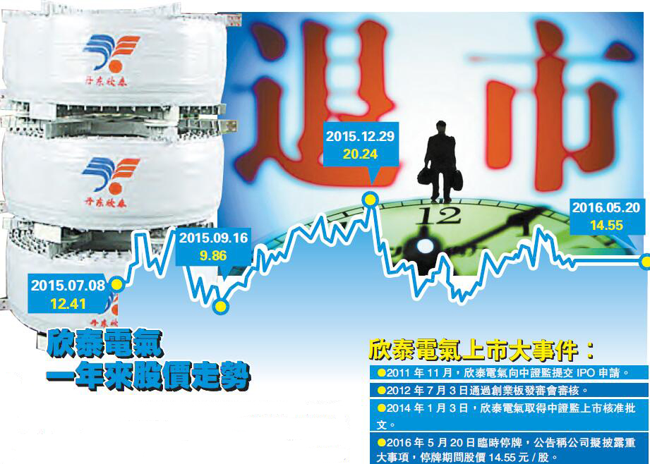 欣泰电气昨日公告称,公司7月7日收到中证监《行政处罚决定书》及《市场禁入决定书》,中证监对欣泰电气及相关当事人作出了行政处罚及市场禁入决定。公司股票将於7月12日开市起复牌,交易30个交易日后,预计於8月23日开市起停牌,深交所在公司股票停牌后15个交易日内作出是否暂停股票上市的决定。自7月12日起欣泰电气股票复牌交易的30个交易日期间,欣泰电气证券简称将调整为「*欣泰」。欣泰电气今年5月20日公告披露称,中证监最终认定,该公司报送中证监的IPO申请文件中相关财务数据存在虚假记载,并宣布临时停牌。