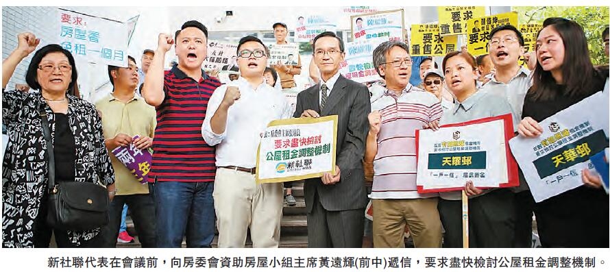 新社联建议尽快检讨公屋租金调整机制;要求机制加入通胀计算因素;要求调租期由2年改回3年一次;并认为今年应提供免租措施,纾缓公屋户经济压力;及要求完善租金援助计划。