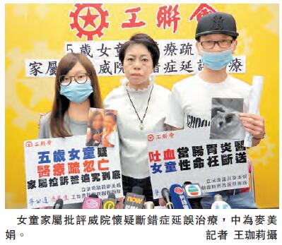 【香港商报网讯】记者王珈莉报道:5岁女童梁凯晴,去年11月中旬突然在街上晕倒,被送往北区医院接受治疗,及後转介沙田威尔斯亲王医院诊治,一直未能找出病因。今年初女童再晕倒吐血,院方只表示她患上肠胃炎,但出院後再晕倒,最终不治。女童家人投诉威院轻视女儿的病情,要追究院方责任。威院回应称,由於未能确定女童死因,个案已呈交死因裁判官。威院强调,已针对病人临床情况进行多项检查及治疗,并安排跨专科会诊,尽快提供适切诊治,并无延误,期间一直有向病人家长解释病情。院方并向病人家人致以深切慰问,会提供一切可行协助。