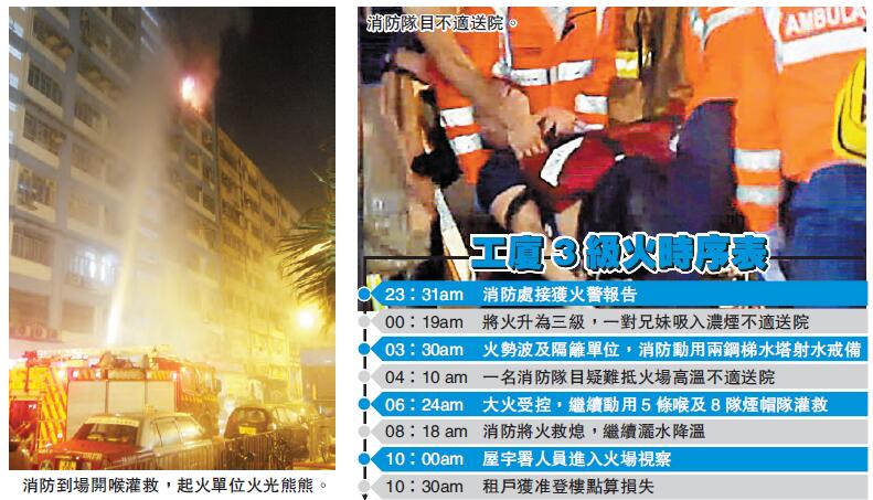 前日深夜11时31分,该货仓突然起火,火光熊熊,冒出大量浓烟,消防接报到场扑救。至凌晨零时19分,将火升为3级,动用升降梯及派出烟帽队灌救,现场火舌直喷出窗外,街坊纷纷围观,由於天气酷热加上火势猛烈,有街坊形容现场附近像火炉般灼热。期间大厦内一对分别16岁及14岁兄妹一度被困,最后由消防员救出,同送往明爱医院,2人经治理后情况稳定。两人生父到医院探望后声称,两兄妹与母亲及继父居於工厦内。