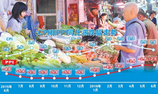 【香港商报网讯】国家统计局昨日发布的2016年6月份全国居民消费价格指数(CPI)和工业生产者出厂价格指数(PPI)数据显示,CPI环比下降0.1%,同比上涨1.9%;PPI环比下降0.2%,同比下降2.6%。分析人士认为,货币政策宽松空间或将再度打开。另有专家建议应该在数据方面强化PPI重要性,淡化CPI。