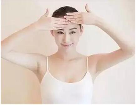 將兩手手掌指尖相對放在前額,從中線向兩邊單方向推搓,每天30~50下。此法可以清醒神志,延緩“抬頭紋”的出現,早上醒來後操作更好。