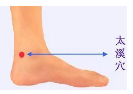 在足內側,內踝尖與跟腱間的凹陷處。采取坐位,雙腳自然向上分開,或取盤腿坐位。然後用雙拇指點按或按揉太溪穴,以感到酸痛為適宜,能夠溫腎補陽,對於陽虛引起的怕冷、四肢冰涼有較好的療效。