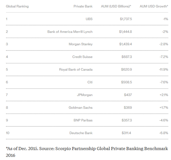 財富管理咨詢公司Scorpio Partnership的年度報告顯示,截止2015年底,全球私人銀行界的三巨頭為瑞銀集團,美銀美林和摩根士丹利,合計管理4.6萬億美元的私人財富。