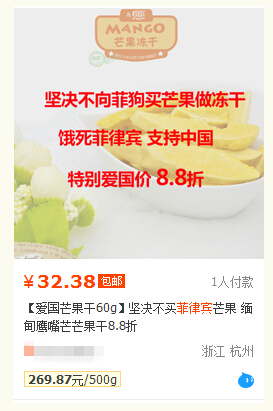 淘寶買家首先引發了抵制菲律賓芒果干的行動,賣家接招,紛紛將“菲律賓”這幾個字替換掉。