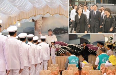 【香港商報網訊】蔡英文昨日出席被雄三飛彈誤射枉死的翔利升號船長黃文忠告別式,海軍有百餘官兵致哀,場面肅穆隆重。公祭會場,懸挂的蔡英文追悼輓聯「梓里同悲」、副台灣地區領導人陳建仁輓聯是「遽返道山」。圖中為「國安會」秘書長吳釗燮,右為高雄市長陳菊。