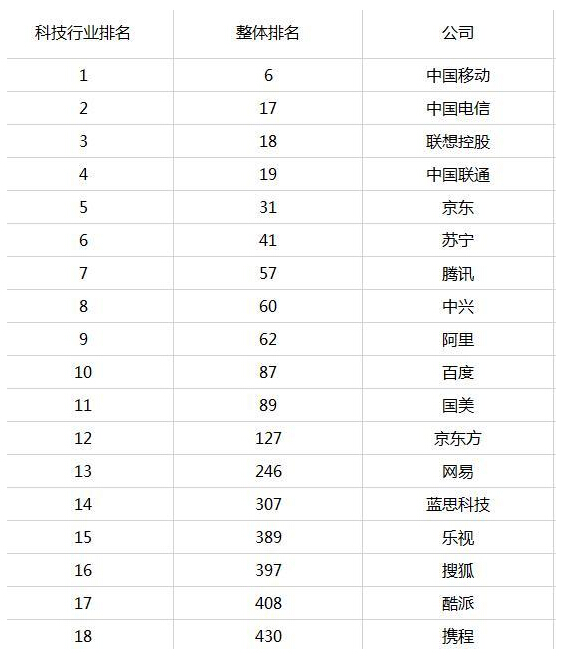 中國電信,排名17;聯想控股,排名18;中國聯通,排名19;京東商城,排名31;美的集團,排名39;蘇寧云商,排名41;TCL集團,排名56;騰訊控股,排名57;格力電器,排名58;中興通訊,排名60;阿里巴巴集團,排名62;中國通信服務股份有限公司,排名71;百度,排名87;四川長虹電器,排名88,;國美電器控股,排名89。