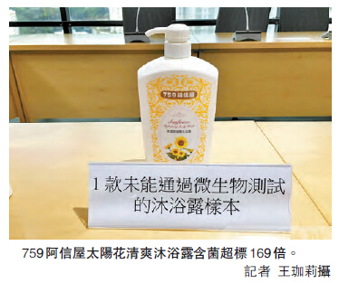 【香港商報網訊】記者王珈莉報道:沐浴產品基本上是每一家庭的必需品,坊間選擇眾多,價錢各有差異。但產品是否安全,似乎乏人關注。消委會測試了60款沐浴產品,發現其中一款「759阿信屋太陽花清爽沐浴露」的菌落總數,竟然超過標準上限169倍,霉菌和酵母菌總數亦比標準高出上限28倍,是唯一未能通過微生物測試的沐浴露樣本。消委會指出,使用有關產品有機會增加皮膚受感染風險,相信有關產品在生產時未有使用防腐劑,因而導致含菌量超標。消委會引述759回覆稱,有關產品在今年初引入試賣,現已沒有入貨及已下架。