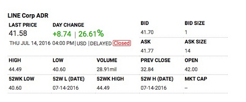 Line周四的開盤價為42美元,較IPO發行價上漲28%。在周四早盤交易中,Line股價最高上漲至44.49美元,最低為40.60美元。截至周四收盤,Line股價上漲8.74美元,收報于41.58美元,漲幅為26.61%。