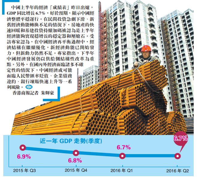 中國上半年的經濟「成績表」昨日出爐,GDP同比增長6.7%,好於預期,顯示中國經濟整體平穩運行。在民間投資急劇下滑、新舊經濟動能轉換不足的情况下,房地產的快速回暖和基建投資持續加碼被認為是上半年經濟能夠實現穩增長的穩定器和壓艙石。受訪專家認為,在中國經濟再平衡過程中,經濟結構在繼續優化,新經濟動能已開始發力,但新動力仍然不足。專家指出,下半年中國經濟發展仍以供給側結構性改革為重點。另外,在國內外經濟面臨諸多不確定性的情况下,中國經濟或可能面臨人民幣匯率貶值、企業債務違約、銀行壞賬快速上升等一系列風險。香港商報記者朱輝豪
