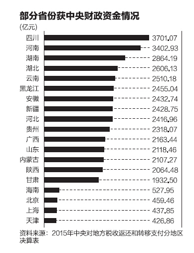 根據2015年中央對地方一般性轉移支付分地區決算表,四川、河南兩地獲得中央支持超過2000億元,湖北、湖南、新疆、甘肅、陜西、云南、貴州、廣西、江西、安徽、黑龍江、內蒙古、河北等地獲得中央支持超過1000億元。
