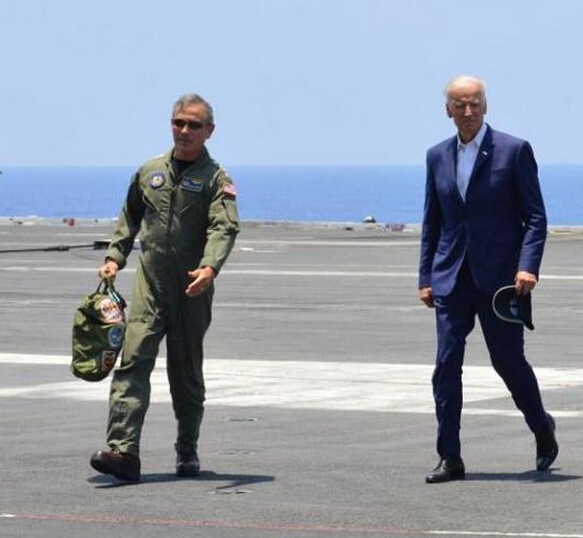 美國副總統拜登(右)與美軍太平洋司令部司令哈里斯14日登上“約翰·斯滕尼斯”號航空母艦(美國海軍學會新聞網站)