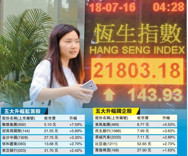 焦點股方面,聯想(992)推AR手機及獲主席楊元慶增持,股價即市曾升8.2%,收市升7.5%報5.1元,為升幅最大藍籌。近日遭馬化騰環球基金會減持的騰訊(700)股價好淡爭持,收市升0.1%報185元。上周五遭盈警拖累的招商局(144),股價亦隨市反彈5.9%,報21.55元。