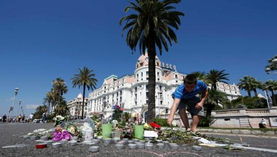 法國尼斯,一名男孩在事發地點放上白玫瑰,為遇難者哀悼。