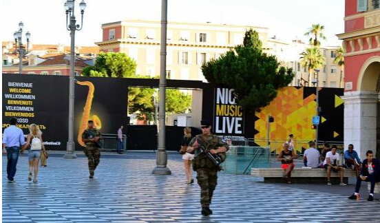 當地時間7月16日,軍人在尼斯市中心廣場上巡邏。 中新社記者 龍劍武 攝