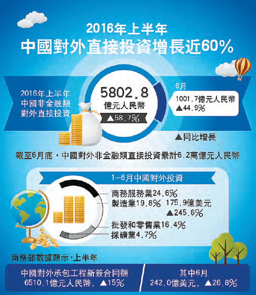 沈丹陽表示,今年上半年,內地非金融類對外直接投資達5802.8億元人民幣,同比增長58.7%。6月,內地對外直接投資1001.7億元,同比增長44.9%。截至6月底,內地對外非金融類直接投資累計6.2萬億元。