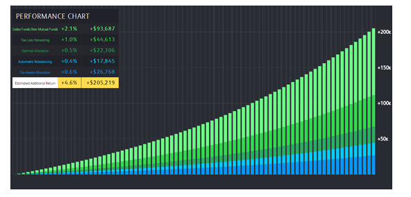 根據Welthfront的宣傳,他們認為自己每年可以給客戶提高4.6%的收益,而這部分收益經年累月可以幾十年中為客戶帶來額外200%的收益,看著的確是誘人。