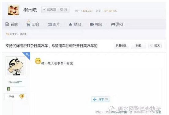 19日上午,網安民警巡查發現網民“Seven柒罒”在《百度貼吧——衡水吧》發表題為“支持民間組織打砸日美汽車,希望用車鎖砸死開日美汽車車主”的貼文,該網民還在帖文中聲稱:“砸不死人這事都不算完”。網安民警根據發帖線索展開偵查,很快找到網民王某。