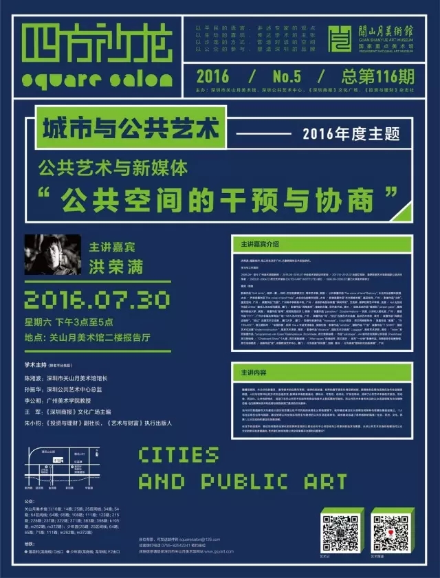 【香港商报网讯】记者林涛报道:7月30日下午,深圳公益性文化品牌四方沙龍舉行今年今年第六場講座,公共藝術與新媒體——“公共空間的幹預與協商”,主講人是為廣州美術學院副教授洪榮滿先生。