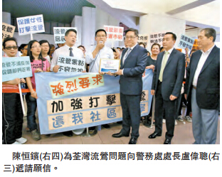 【香港商报网讯】记者万家成报道:荃湾区内流莺猖獗,居民昨上街游行,要求警方加强执法行动,让荃湾社区得到安宁。游行队伍由荃新天地出发,途经河背街及众安街的旧区,最终到达荃湾区议会,向出席区议会会议的警务处处长卢伟聪递交请愿信。